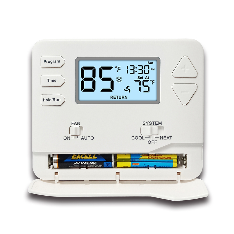 Zusätzlich zu seinen digitalen Fähigkeiten wird der HVAC-Thermostat von einer 24-V-Batterie für zuverlässige Leistung und lange Lebensdauer betrieben. Die Kombination aus 24-V-Stromversorgung und Batterie-Backup gewährleistet einen unterbrechungsfreien Betrieb, sodass Sie sich darauf verlassen können, dass dieser Thermostat Ihre gewünschten Temperatureinstellungen ohne Unterbrechungen beibehält.